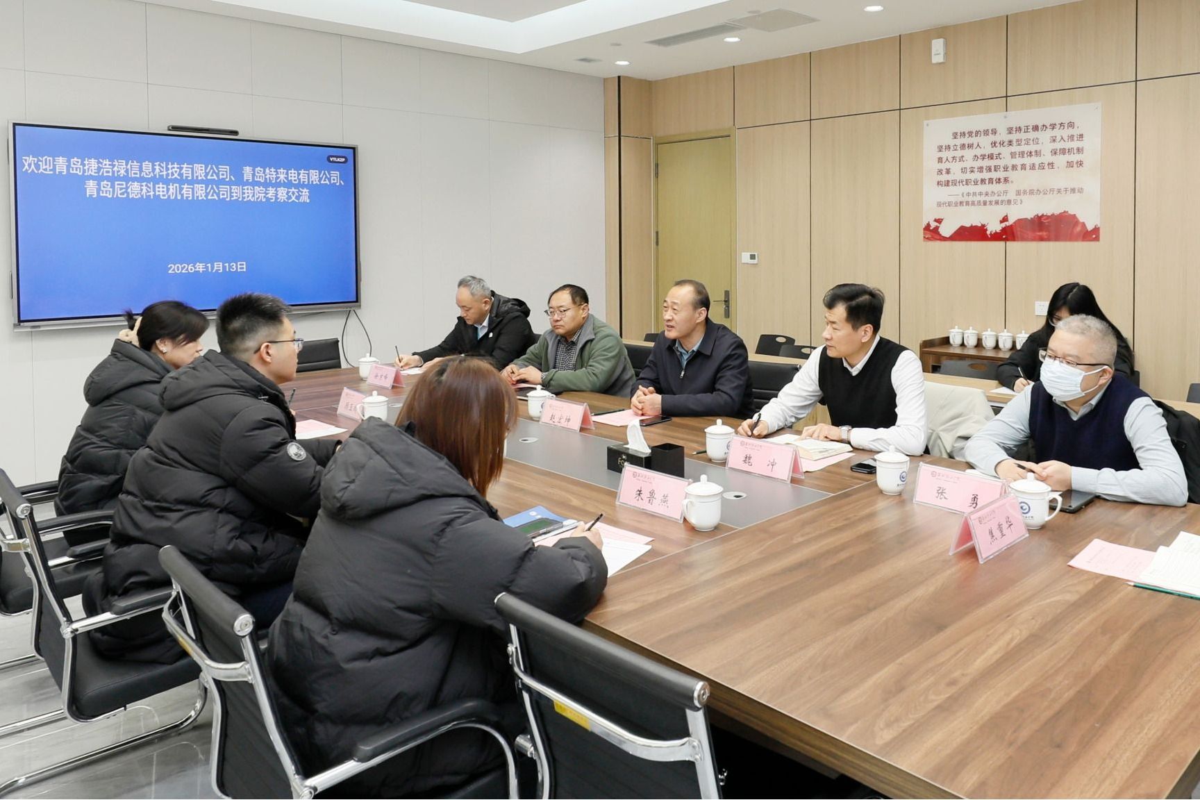 1月13日上午,青岛捷浩禄信息科技有限公司总经理董培臣、特来电新能源股份有限公司人事经理顾玉玲、尼得科电机(青岛)有限公司人事经理朱鲁燕三人,到我院就校企合作、毕业生就业等事宜进行深入洽谈。学院党委委员、副院长赵宏坤会见客人。招生就业处主要负责同志,机电工程学院、汽车工程学院、信息工程学院有关工作负责同志参与座谈。