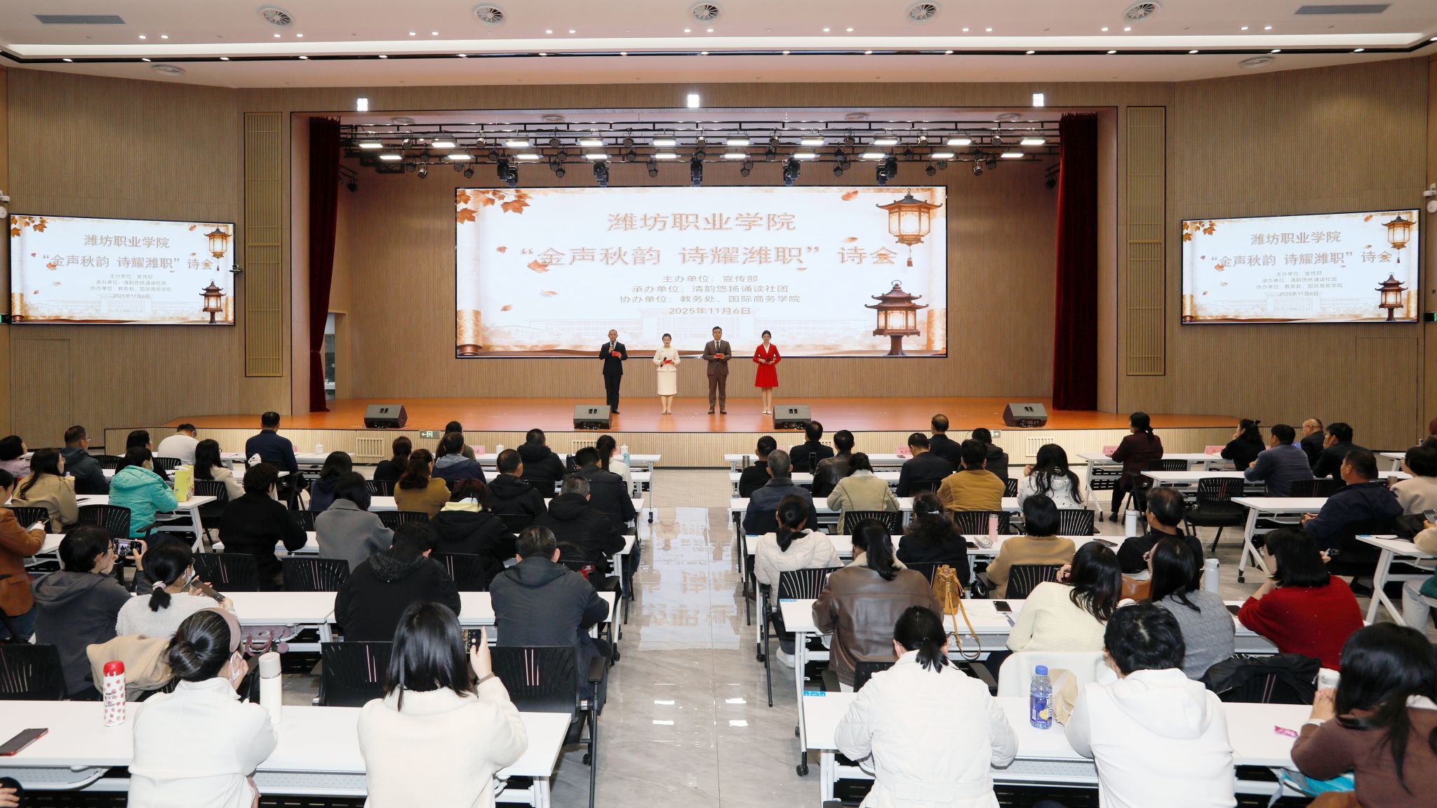 为营造浓厚的书香校园氛围,传承中华优秀文化,厚植文化根基,增强师生民族文化认同感,11月6日,学院在滨海校区综合楼一楼西侧报告厅举办“金声秋韵 诗耀潍职”主题诗会。学院党委副书记贺志强,党委委员高凌云,党委委员、副院长赵宏坤,语委办主任刘泓蔚,党委委员、宣传部部长鞠桂芹及各部门党政负责人、师生代表齐聚一堂,共享文化盛宴。